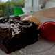 Brownie de chocolate acompañado de helado, fruta y jarabe de fresa o chocolate