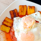 Par de huevos sobre tortilla frita con frijoles, longaniza bañados en salsa roja picosita y acompañados de platano macho