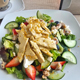 Mix de arúgula, lechuga y espinaca, fruta, pepino, ajonjolí garapiñado y queso de cabra, acompañada de pollo