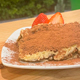 Tiramisú a base de café y queso mascarpone, coronado con cacao